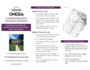The Homeownership by Independent Purchase (HIP) Program helps to increase Oneida enrolled members homeownership; increase the land base available for the fee-to-trust process, while simultaneously affording you a greater independence in the purchase process by requiring the buyer to negotiate the purchase offer independent of the Nation.
